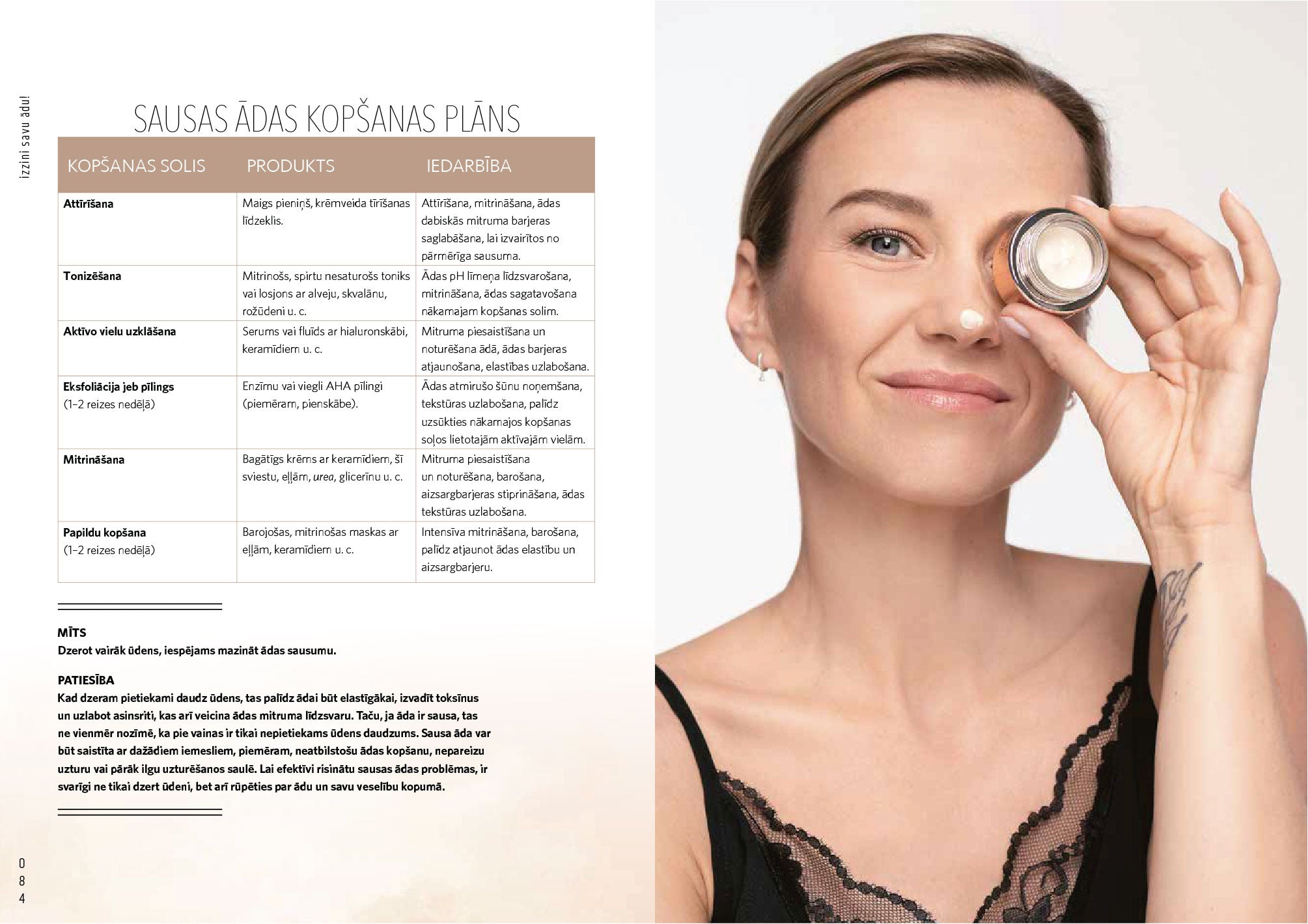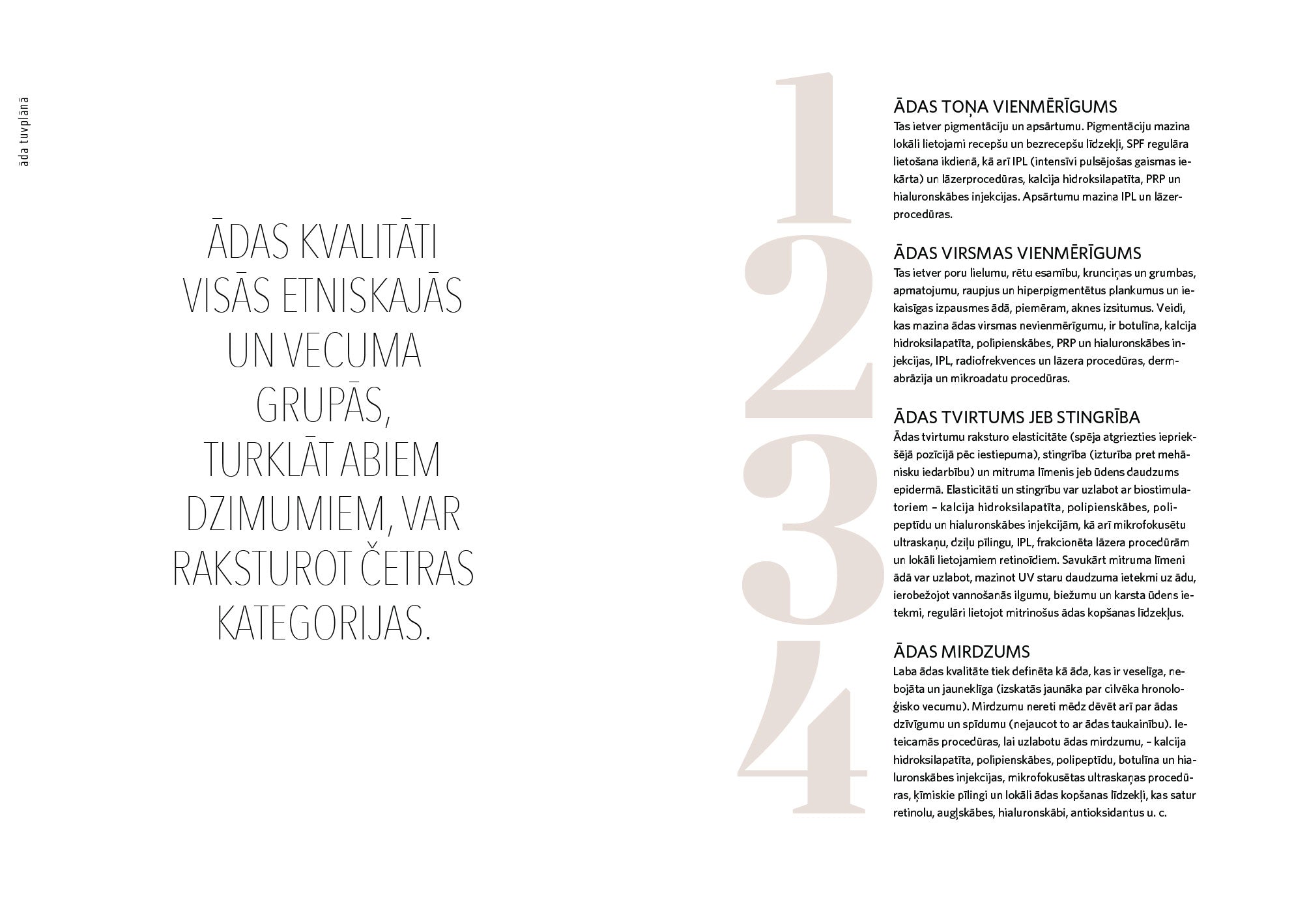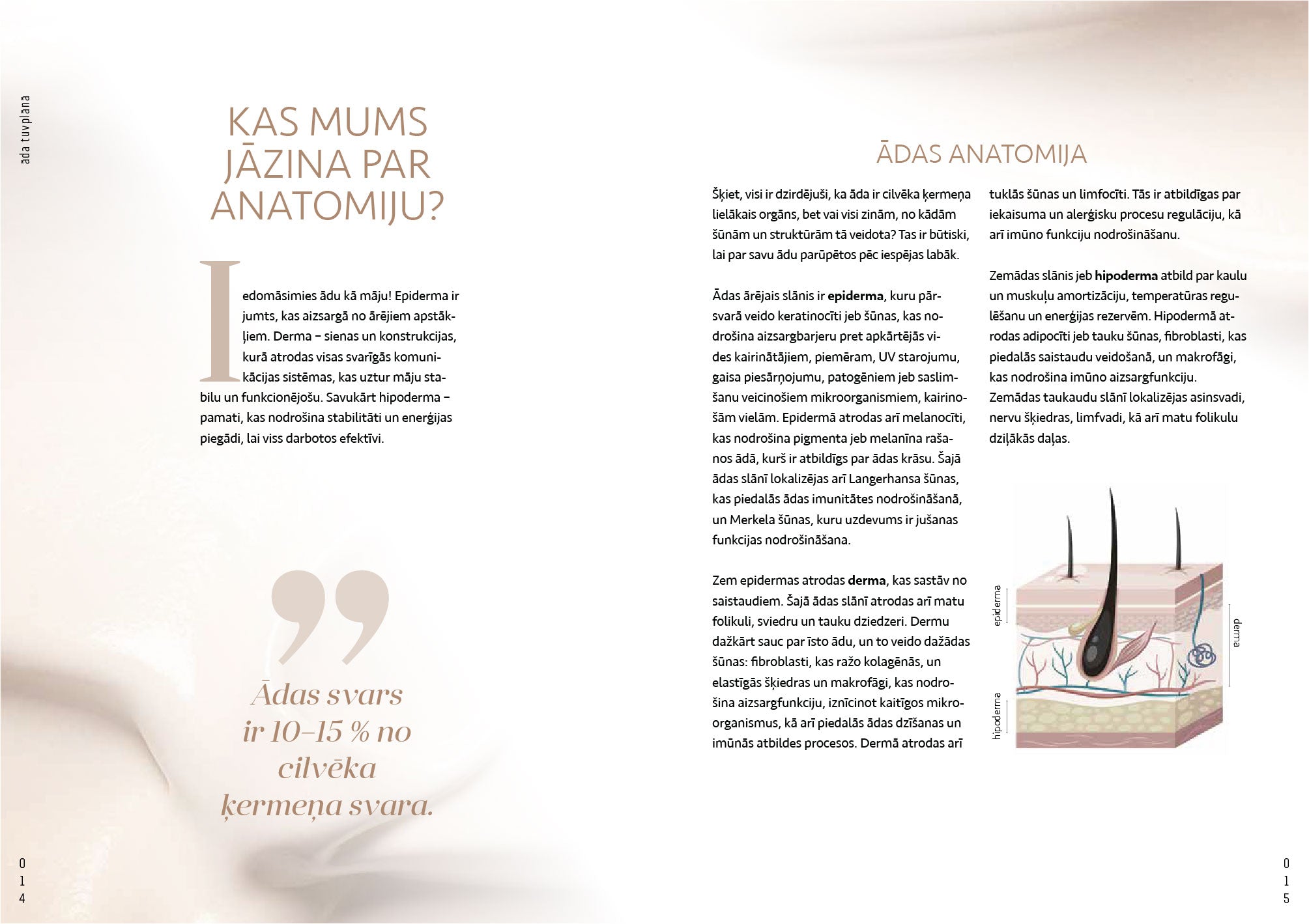 Tajā apkopoti praktiski padomi, kā uzturēt ādu veselīgu un skaistu, un piedāvāta dziļāka izpratne par ādas struktūru, tās saikni ar organisma iekšējiem procesiem un mijiedarbību ar vidi.